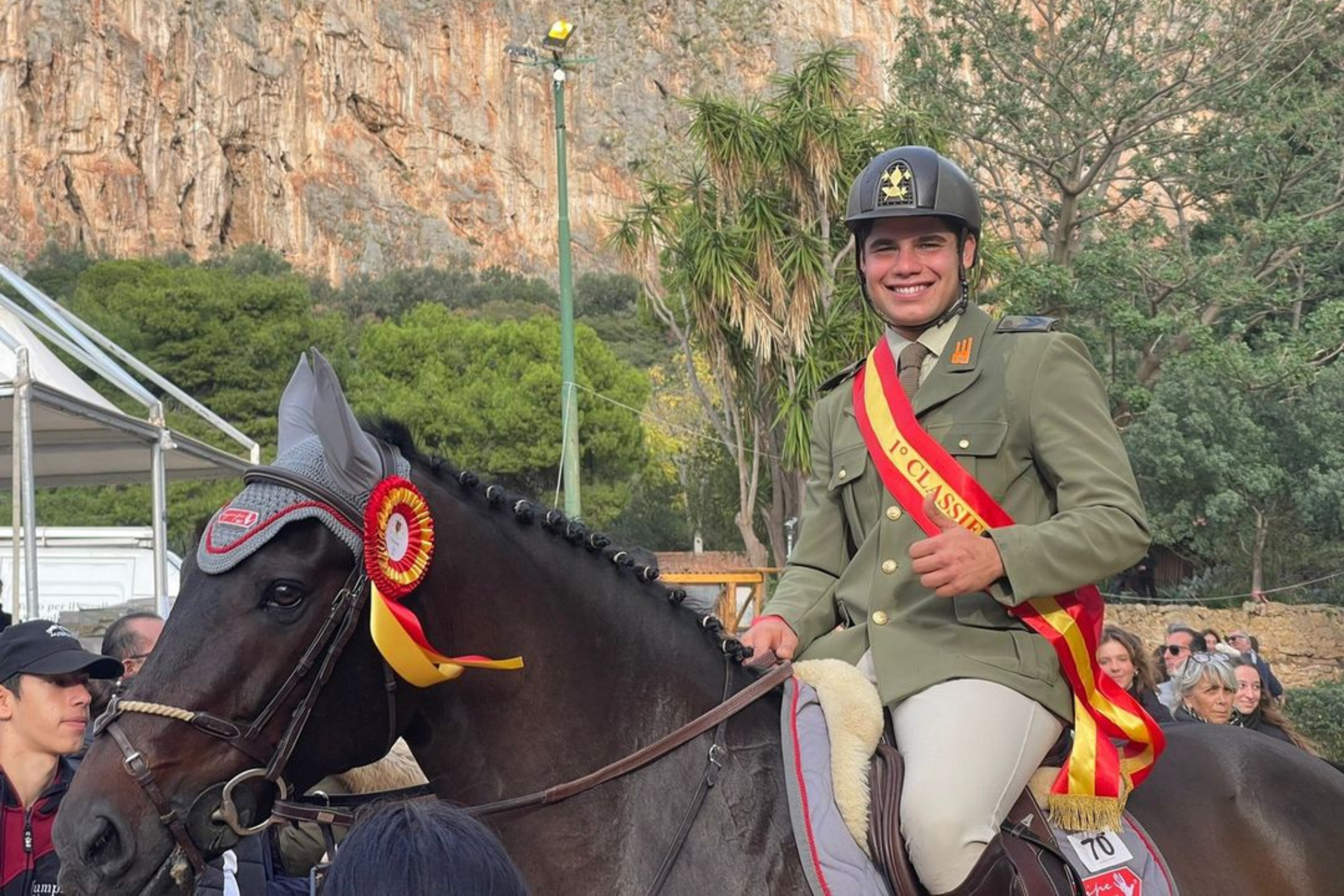 I piazzamenti dei cavalieri azzurri nella top ten del Grand Prix di Palermo proseguono con il quinto posto di Diego Cuzzocrea e Messhargos (4 – 75”.62.), In sesta posizione troviamo per l’Arma dei Carabinieri Elisa Chimirri e Calandro Z (4 – 75”.74.), settimo l’Agente Scelto Luca Coata e Holly del Rilate (4 – 75”.79.). Si è piazzato ottavo Omar Bonomelli su Chippendel de la Tour (5 – 77”.66.), infine ha chiuso in nona posizione l’Appuntato Emanuele Gaudiano e Crack Balou (8 – 70”.29.).