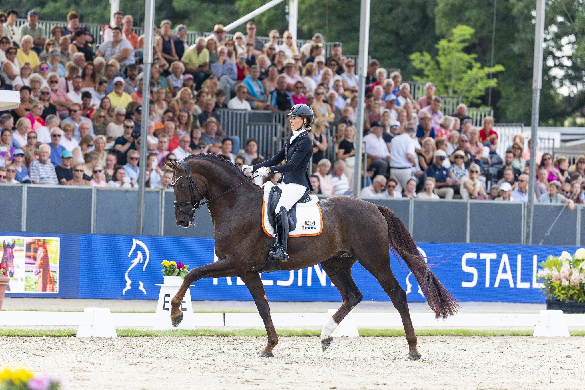 L’argento è andato a Leonie Richter (GER) con Most Wanted Nero von Bellin, il cavallo più ricercato della KWPN, che ha gareggiato per l’Olanda. Inizialmente prima riserva, la coppia ha sfruttato al meglio la sua occasione. “Aveva ancora molto da imparare quest’inverno ed era ancora piuttosto acerbo durante le prove di selezione olandesi. Ero già contenta di essere riserva, quindi gareggiare qui e aggiudicarsi l’argento è fantastico. È cresciuto in sicurezza e rilassatezza durante questo campionato“.