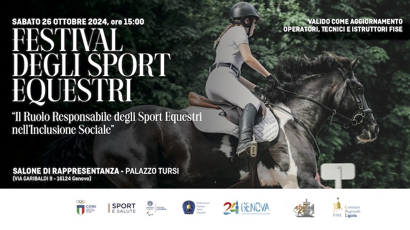Il Festival degli Sport Equestri si aprirà sabato 26 ottobre alle ore 15.00 presso il Salone di Rappresentanza di Palazzo Tursi, in via Garibaldi 9, con il convegno “Il Ruolo Responsabile degli Sport Equestri nell’Inclusione Sociale”.