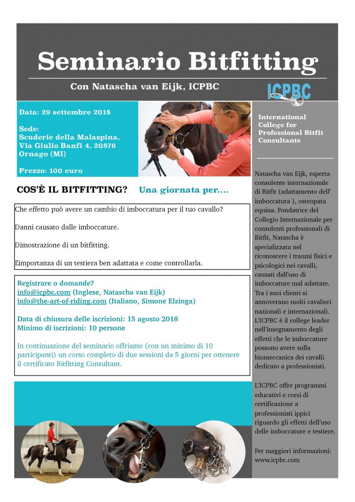 L’appuntamento con il primo seminario, organizzato da The Art of Riding (Simone Elzinga), è per il 29 settembre prossimo, presso le Scuderie della Malaspina (Ornago – MI) con Natascha van Eijk, esperta consulente internazionale di Bitfit (adattamento dell’ imboccatura), osteopata equina.