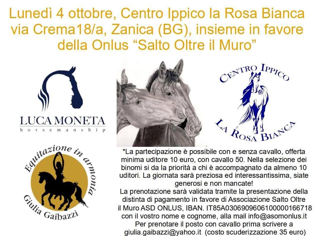 -ritrovo alle 9,15 presso il Centro Ippico La Rosa Bianca, in via Crema 18/A a Zanica (BG), nuova sede dell’ Associazione Oltre il Muro, con il benvenuto del presidente Claudio Villa che illustrerà e racconterà la filosofia di Salto Oltre il Muro.