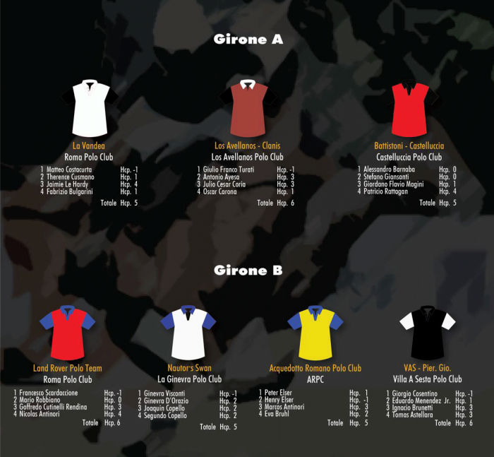 Cinque squadre appartengono a Polo Club romani, delle quali due al Roma Polo Club – La Vandea (hpc 5) e Land Rover Polo Team (hpc 6), ed una a testa a la Castelluccia Polo Club – Castelluccia-Battistoni (hpc 5), La Ginevra Polo Club – Nautor’s Swan (hpc 5) e Acquedotto Romano ARPC – Acquedotto Romano Polo Club (hpc 5).