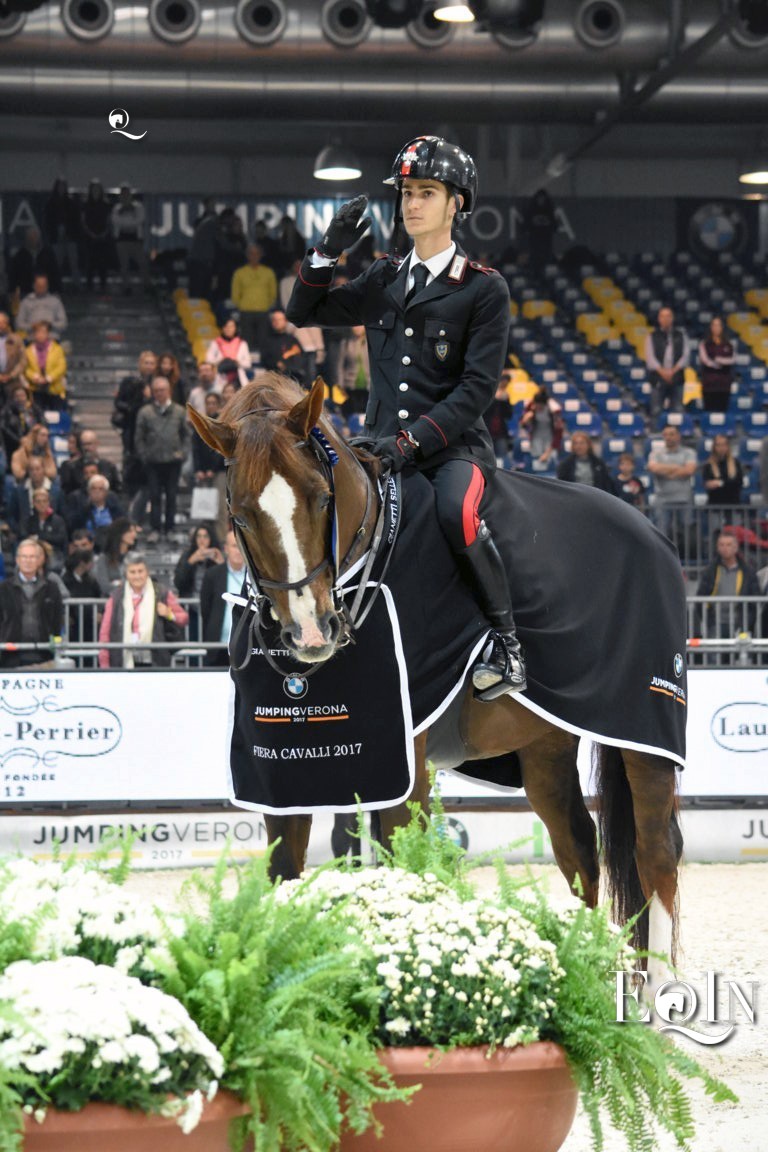 Arriva oggi un importante riconoscimento per il giovane cavaliere di salto ostacoli Filippo Marco Bologni, che veste la divisa dell’Arma dei Carabinieri: stamattina in viale di Tor di Quinto a Roma, nella caserma Salvo D’Acquisto M.O.V.M. dell’Arma (sede del Centro nazionale di selezione e reclutamento – CNSR – del Comando delle unità mobili e specializzate carabinieri “Palidoro”, della Divisione unità mobili carabinieri, dell’8º Reggimento “Lazio”, del 4º Reggimento carabinieri a cavallo, del Raggruppamento carabinieri investigazioni scientifiche – RaCIS – e del Reparto investigazioni scientifiche – RIS – di Roma), si è svolto l’incontro annuale con il Comandante Generale dell’Arma Tullio Del Sette, dove alcuni membri della squadra sportiva dei carabinieri sono stati premiati: tra questi, per ciò che riguarda l’equitazione, Bologni ha ricevuto dalle mani del Generale del Corpo d’Armata Luigi Longobardi (Comandate delle scuole dell’Armata), la medaglia per aver conseguito la vittoria della gara di apertura in Coppa del Mondo al Jumping Verona 2017 (27 ottobre 2017: +info: clicca qui).