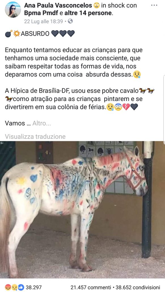 E’ finita oggi tra le pagine del quotidiano on line repubblica.it la notizia relativa ad una pratica ludica, purtroppo assai diffusa, che ha suscitato parecchio scalpore: dipinto dal muso alle gambe, criniera compresa, un cavallo grigio è stato utilizzato da una scuola di equitazione di Brasilia per intrattenere un gruppo di bambini. Scrive C. Fonte che “la foto dell’animale – in copertina – è stata postata su Facebook dall’associazione per i diritti degli animali Orden de Abogados de Brasil (Oab) e in poche ore ha fatto il giro del mondo, provocando polemica tra gli utenti. L’accusa è di maltrattamento“. L’Istituto brasiliano dell’ambiente (Ibama) ha inviato rappresentanti sul posto per verificare lo stato di salute dell’animale e per valutare l’attività svolta. “Mentre cerchiamo di educare i bambini per costruire una società futura più consapevole, questo è quello che ci troviamo davanti”, ha scritto nel post di denuncia l’attivista della Ong e avvocato Ana Paula Vasconcelos, rimasta sconvolta per le attività che vengono proposte dal maneggio ai bambini. Secondo la donna i piccoli devono essere educati in modo tale da saper rispettare tutte le forme di vita”.