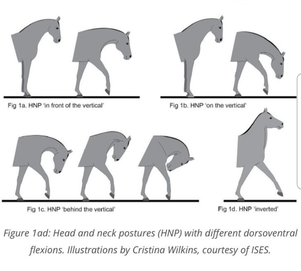 In molti casi, certe posizioni di collo e testa dei cavalli non possono essere mantenute autonomamente dall’animale: alcuni equidi proprio non riescono a fare quel che gli viene richiesto (specie se è troppo), altri solo per un certo periodo di tempo e solo “sotto costrizione”. Va da sé che ci sono prove sostanziali che posture di testa e collo non corrette abbiano un impatto negativo sul benessere/salute del cavallo, con conseguenze assai deleterie. Quando si mettono sulla bilancia gli effetti di training siffatti, che hanno peso evidente sulla compromissione del benessere equino, rimangono pochi motivi per cui l’uso di queste posture estreme nell’allenamento (specie iperflesse) dovrebbero esser considerate pratiche anche solo vagamente accettabili negli sport equestri.