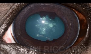 Su quelle che sono patologie infiammatorie, progressive, primarie o ereditarie la prevenzione consiste nell’effettuare una visita più precoce possibile. Per esempio, abbiamo di recente scoperto una nuova patologia corneale che si presenta tipicamente nel cavallo frisone, maschio, tra gli 8 e i 10 anni. In casi come questi, si consiglia una visita oculistica degli stalloni intorno ai 7-8 anni per prevenire l’insorgere di problemi. Il purosangue, invece, è predisposto allo sviluppo di cataratte. Apro una piccola parentesi sulla cataratta, perché trattasi di una patologia assolutamente operabile ma, a causa della generale disinformazione di base, molta gente non ne è a conoscenza e pertanto non cura l’animale. Dal 2006 vengono prodotte lenti intraoculari per cavalli consentendo, in soggetti in cui vi siano le indicazioni chirurgiche, di riportarli ad una condizione di visione corretta anche dal punto di vista diottrico. Quindi, chiudendo questa importante parentesi, per tutto quello che concerne patologie tipiche di razza la visita oculistica può essere determinante per la prevenzione. Per tutto quello che, invece, riguarda patologie di tipo traumatico, la prevenzione può essere fatta solo con una buona gestione dell’animale. Ad esempio mi è capitato di intervenire su lacerazioni palpebrali causate da ganci porta finimenti agganciati al box durante i concorsi, piuttosto che gravi contusioni oculari traumatiche causate dalla rottura di elastici cui vengono agganciati i cavalli lungo i corridoi delle scuderie. La visita oculistica, in ogni caso, è utile per prevenire oppure individuare fin dal principio problemi oculari, sebbene il discorso preventivo sia ancora un tema lontano dall’entrare nella mentalità quotidiana dei proprietari di cavalli.