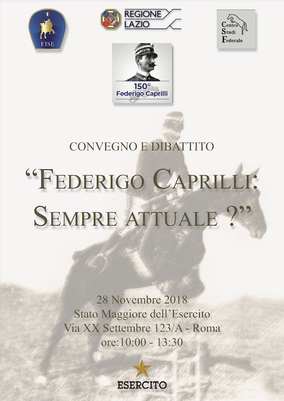 Un importante Convegno-dibattito dal titolo “Federigo Caprilli. Sempre attuale?”, si svolgerà mercoledì 28 novembre alle ore 10:00, presso la Biblioteca Militare Centrale (Via XX Settembre, 123/A) a Roma.