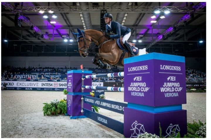 © Comunicato Stampa Equi-Equipe/Jumping Verona ; foto Il britannico Ben Maher e Dallas Vegas Batilly, binomio vincitore del Gran Premio di World Cup a Verona nel 2023 – © FEI / M.Argenziano