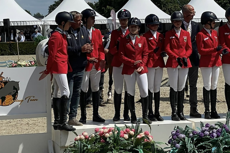 Il team – formato da Bassan Camilla su Lasco van de Ganzenakker (BWP del 2011; Ogano Sitte x Muscaris d’Ariel; 12); Gatti Bardelli Giulia su Clarisse (Holsteiner del 2010; Clearway x Limbus; 12); Lia Zoe su Lizabella (Oldenburg del 2010; Lordanos x Landadel; 8) e Ripamonti Francesca su Dancer van de Helle (sBs del 2009; Castelino van de Helle x Con Air; elm) – ha chiuso in 11^ posizione con 32 penalità nel primo percorso.