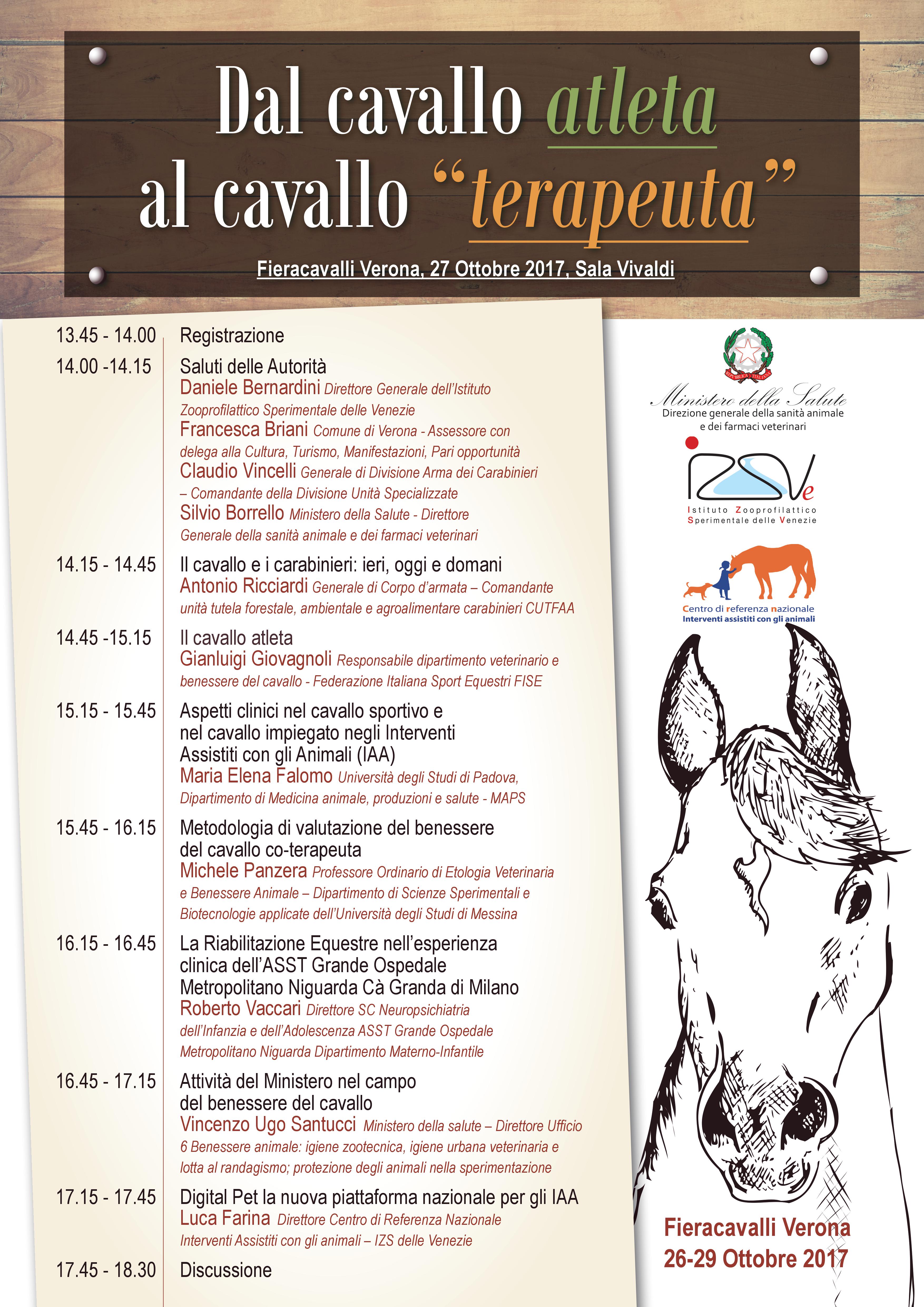 Il Ministero della Salute parteciperà anche quest’anno a Fiera Cavalli Verona, tradizionale appuntamento per gli appassionati e gli addetti al settore del mondo equestre che la prossima settimana giungerà alla sua 119^ edizione. Venerdì 27 ottobre 2017, con inizio alle ore 14.15 presso la sala Vivaldi di Fiera Cavalli, la Tavola Rotonda “Dal cavallo atleta al cavallo terapeuta“.