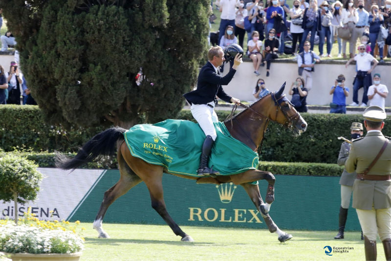 Il percorso, ideato dal Maestro Uliano Vezzani, costruito su tredici ostacoli e sedici sforzi (se consideriamo le due combinazioni presenti), ha messo a dura prova i cinquanta binomi al via: tra i salti con più errori nel tracciato di base il verticale d’apertura targato MAG, l’oxer firmato Intesa San Paolo e la doppia gabbia dello sponsor della gara, Rolex. Sono stati solo quattro i percorsi netti al 1° round, cosa che comprova l’altissimo livello tecnico richiesto ai top riders al via. Da notare anche che nessuno dei binomi presenti, quelli vincitori del prestigioso Gran Premio Roma delle precedenti edizioni, ha avuto accesso al secondo round. A quest’ultimo, composto da otto ostacoli con una combinazione, ha avuto accesso il 25% dei presenti, quindi tredici binomi; per il computo finale si sono sommate le penalità delle due fasi, più il tempo della seconda prova. Anche senza formula a barrage, ovviamente è stato il tempo a farla da padrone: sono stati solo tre gli 0/0 realizzati, quelli dei cavalieri che hanno composto il podio dell’edizione 2021.