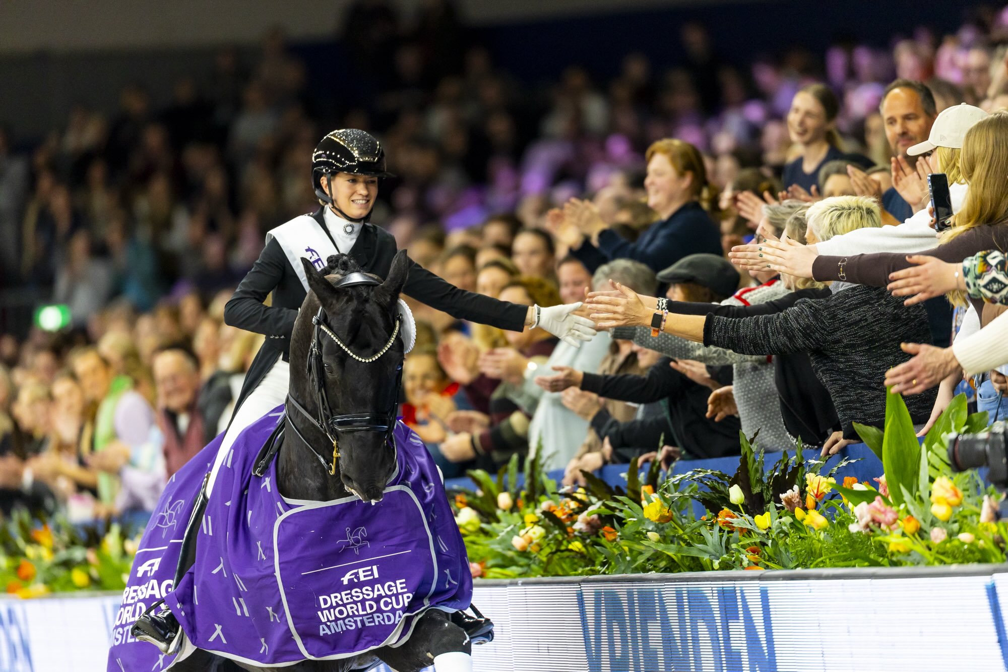 Nell’eccezionale arena di Amsterdam si sono radunati i migliori binomi per l’ottava tappa di qualifica della FEI Coppa del Mondo di Dressage™. La campionessa del mondo in carica Charlotte Fry accompagnata dal formidabile Glamourdale (2011, KWPN, Lord Leatherdale x Negro) ha rivendicato la vittoria con un punteggio impressionante di 89,840%, ma la gara è stata agguerrita. Questa è stata la seconda vittoria consecutiva di Fry ad Amsterdam, dopo il trionfo dell’anno scorso in sella ad Everdale.