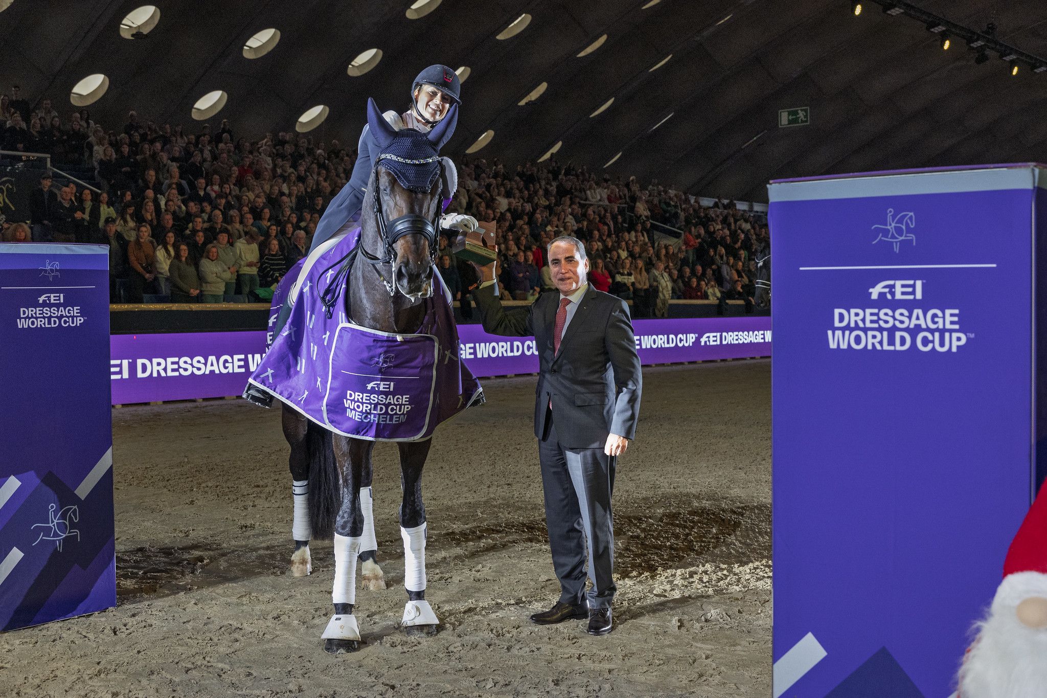© Redaz. ; riproduzione riservata; foto: Dinja van Liere (NED) and Hermes winners of the FEI Dressage World Cup™ 2024/25 – Mechelen (BEL) with FEI President Ingmar De Vos ©FEI/Dirk Caremans