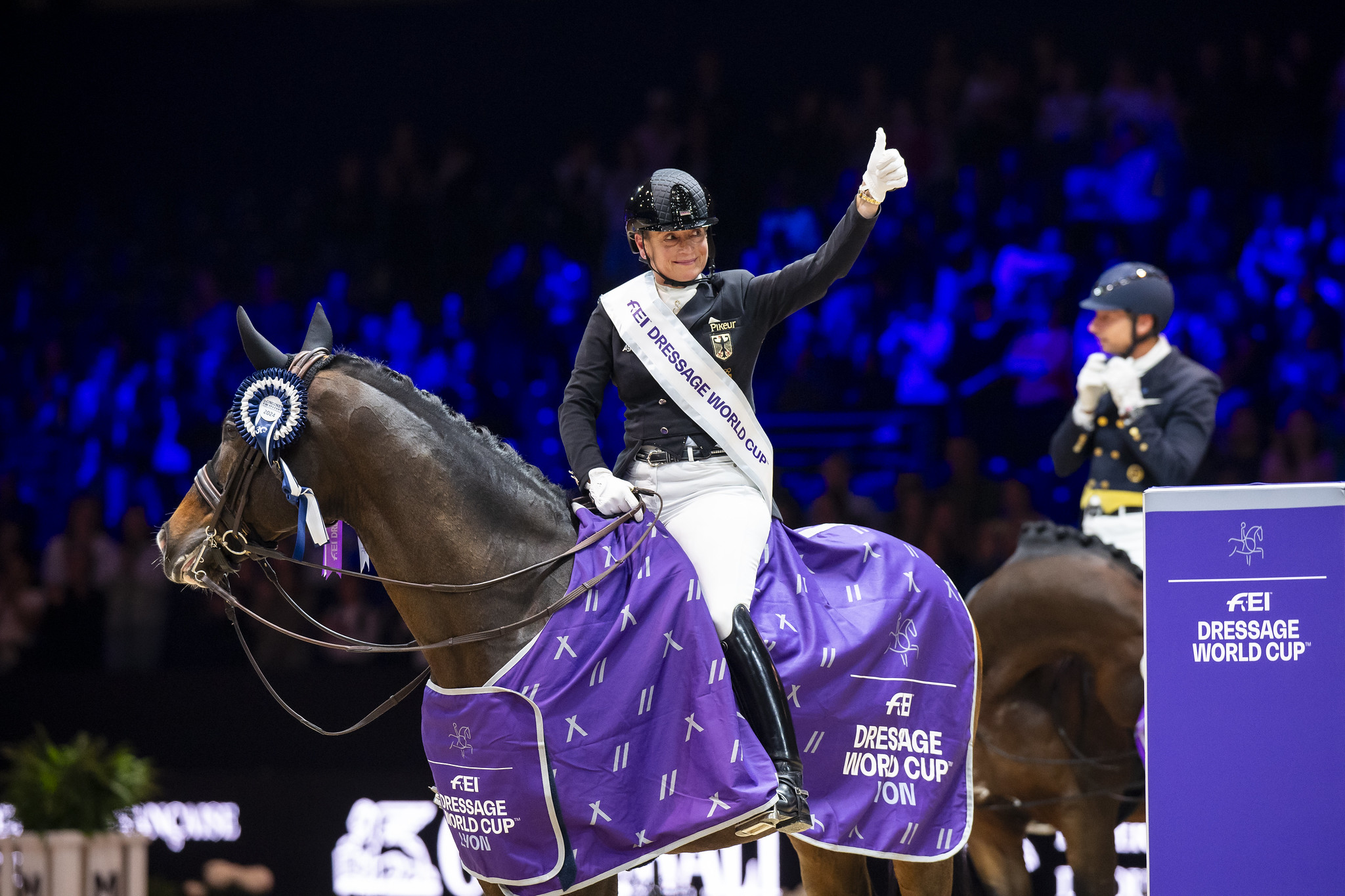 Isabell Werth è entrata in campo per ultima ed è uscita vittoriosa con un vantaggio dominante. In sella a DSP Quantaz, di proprietà di Madeleine Winter-Schulze e Victoria Max-Theurer, ha presentato un freestyle eccezionale, dimostrando precisione e concentrazione. Nel bel mezzo del galoppo allungato, tuttavia, Quantaz si è spaventato e l’amazzone ha poi espresso di quanto fosse contenta per come Quantaz sia riuscito a ritrovare la calma e a finire con forza: “Era estremamente concentrato oggi. Per la prima volta mi aspettava ad ogni movimento. Due anni fa, non lo avrei mai riavuto con me così velocemente dopo un disagio del genere, ma ora l’ho fatto”. Ha poi aggiunto una sua considerazione riguardo la crescita del dressage in Francia: “Il dressage è vivo qui quest’anno; è bellissimo vedere crescere questo entusiasmo. Ogni anno che vengo a Lione, vedo che il numero di visitatori è cresciuto. Ora c’era addirittura il tutto esaurito, con l’atmosfera di uno stadio di calcio”. Per la Werth si è trattato della settima vittoria della FEI Dressage World Cup™ a Lione.