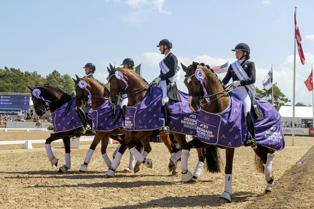 È stato davvero un lavoro di squadra per la Danimarca, i cui cavalieri si sono alternati vincendo questa settimana FEI Grand Prix, Grand Prix Special e Grand Prix Freestyle. La squadra di Daniel Bachmann Andersen (Zippo M.I.), Anna Zibrandtsen (Quel Filou), Nadja Aaboe Sloth (Favour Gersdorf) e Anne Marie Hosbond (Scarlett 712) ha chiuso con un totale di 22 punti vincenti.