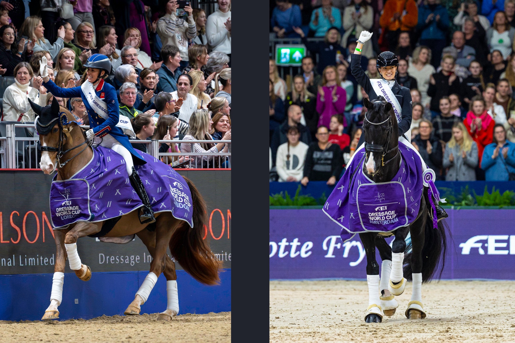 © L. Ruffino – riproduzione riservata; foto: a sx Charlotte Dujardin & Imhotep vincitori della FEI Dressage World Cup™ di Londra, a dx Charlotte Fry & Everdale vincitori della FEI Dressage World Cup™ di Amsterdam © FEI/Jon Stroud/Leanjo de Koster