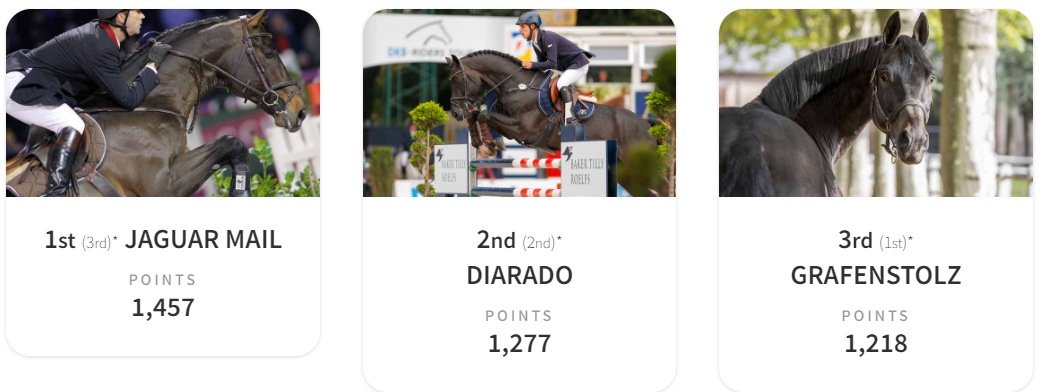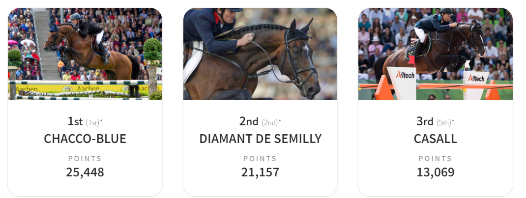 Nel 2021 e per il quinto anno consecutivo, Chacco-Blue è in vetta alla classifica dei migliori stalloni di salto ostacoli. Ampiamente distribuito dal suo proprietario Paul Schockemöhle, i suoi prodotti sono onnipresenti nei CSI a 5*. Sebbene il baio sia scomparso nel 2012, le generazioni di figli nati alla fine degli anni 2000 continuano a detenere la vetta delle classifiche. Tra tutti, un testa: il campione olimpico di Tokyo 2020, Explosion W. Al secondo posto anche quest’anno troviamo Diamant de Semilly (leader nel 2015 e 2016 e per l’8^ volta consecutiva tra i migliori tre padri al mondo). Casall, quinto nel 2020, torna ad occupare la terza posizione.