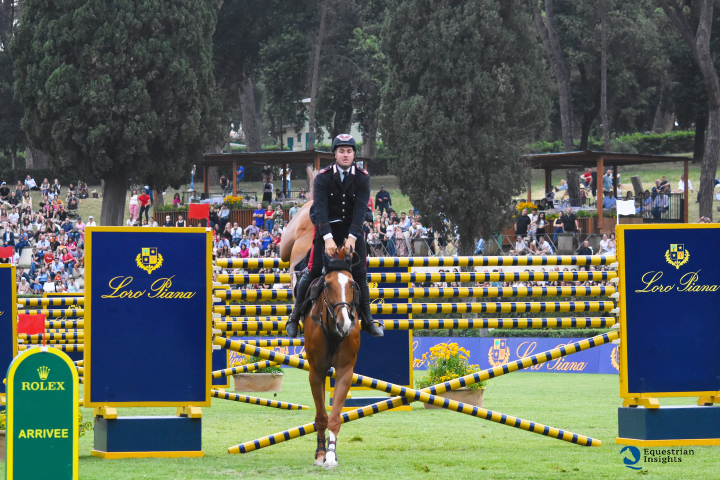 Siamo arrivati alla fine della terza giornata di gare di questa edizione dello CSIO di Roma – Piazza di Siena – Master Fratelli d’Inzeo edizione 2022. Alle 18:15 di questo sabato di maggio ha infatti avuto inizio la SIX BARS presentata da LORO PIANA, spettacolare categoria dal Montepremi di 20.000 euro: la vittoria di questa spettacolare gara è andata all’Appuntato Emanuele Gaudiano con Chalou.