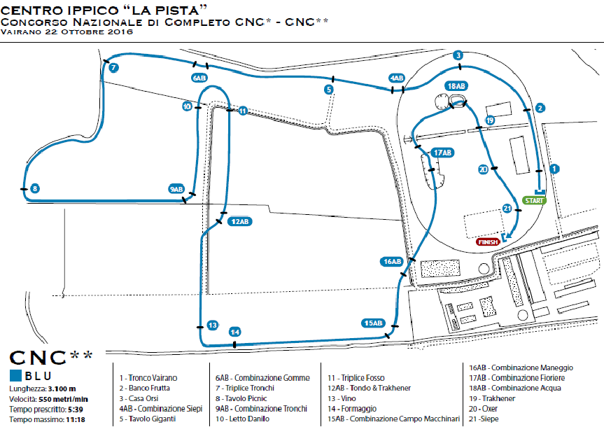 La vittoria del CNC1* (xc course di 2.600 mt totali, velocità 520 m/min, opt. time: 5:00) svoltosi a “La Pista” è stata di Francesca Blasi in sella all’olandese Deauville Beekhoeve (2008), con 46,20 pn totali: è rimasto invariato il punteggio del binomio dopo la miglior prima prova (69,19%) della categoria, il netto in salto ostacoli e l’ottimo cross country, course chiusa senza alcuna penalità in 4:39 (best time tra i 4 percorsi in campagna del CNC1* chiusi senza penalità). 2° e 3° posto nella categoria per i binomi composti rispettivamente da Marco Cappai/Uter (SI 2009, propr. Cascianese Country Club) con 47,00pn totali, e da Luciana Chiara Villani con il tedesco Horaz 11 (2004; propr. Mauro Villani), che ha terminato con 52,80pn.