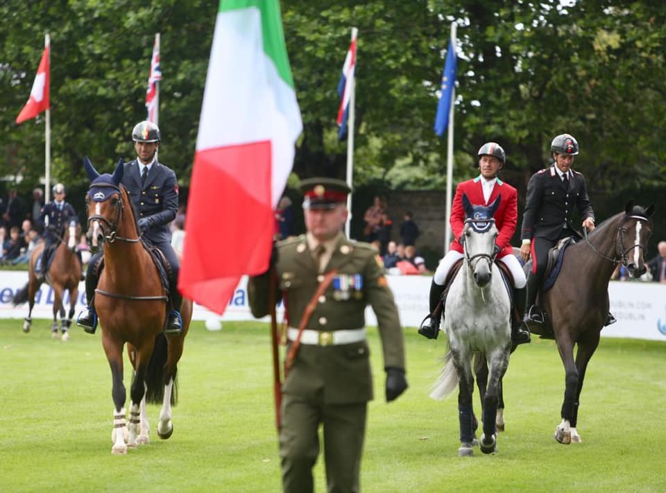 Guidati dal Capo Equipe Duccio Bartalucci, a rappresentare il tricolore oggi Emilio Bicocchi su Evita Sg Z (a cui è spettato l’onere del “calcio d’inizio” in questa Coppa: l’Aviere Capo ha chiuso la sua gara con 4/4), l’Appuntato scelto Massimo Grossato con Lazzaro delle Schiave, Paolo Paini su Ottava Meraviglia di Ca’ San Giorgio, e il 1° aviere scelto Lorenzo De Luca su Dinky Toy Vd Kranenburg. Dopo i due percorsi netti al 1° round, realizzati da Grossato (0/4) e De Luca (0/4), il team azzurro ha potuto contare sull’eccezionale netto realizzato da Paini nel 2° round (4/0), determinante per questa seconda posizione dell’Italia! Alle nostre spalle, al terzo posto, la squadra padrona di casa, l’Irlanda, che ha concluso con 16 penalità complessive.