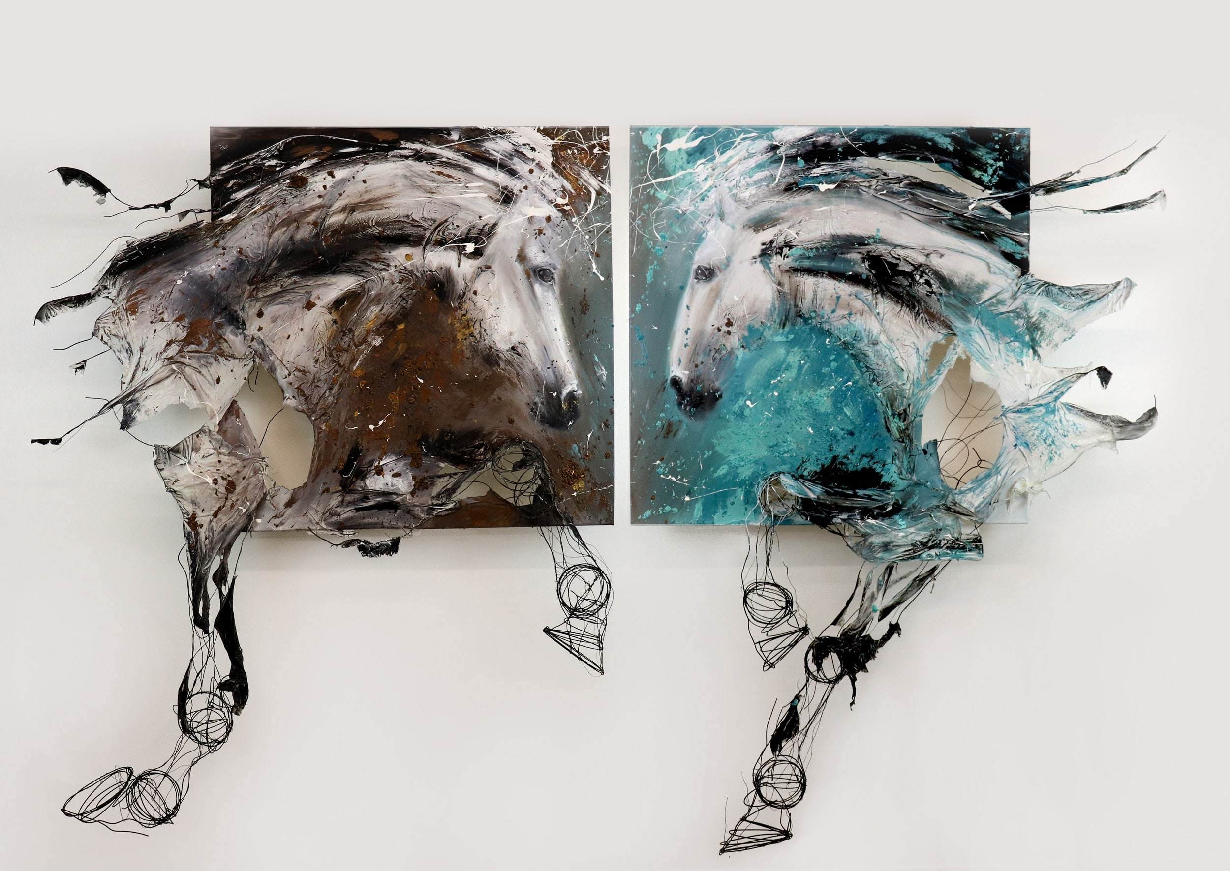 “È una tecnica che ho sperimentato da autodidatta perché avendo frequentato il liceo classico non ho mai studiato Arte e ho continuato a sperimentare sempre cose nuove. Diciamo che questa tecnica è nata perché non mi bastava più la bidimensionalità della tela e non mi bastava essere solo una pittrice. Per me il cavallo è un’allegoria dell’emozione, che deve esternarsi. Perciò il dipinto subisce una metamorfosi, diventa scultura nel fil di ferro che rappresenta lo schizzo embrionale di quando il cavallo è ancora nella mia testa. Il mio concetto è proprio di non avere limiti, cioè di non scegliere se essere pittrice o scultrice ma un ibrido tra questi due”.