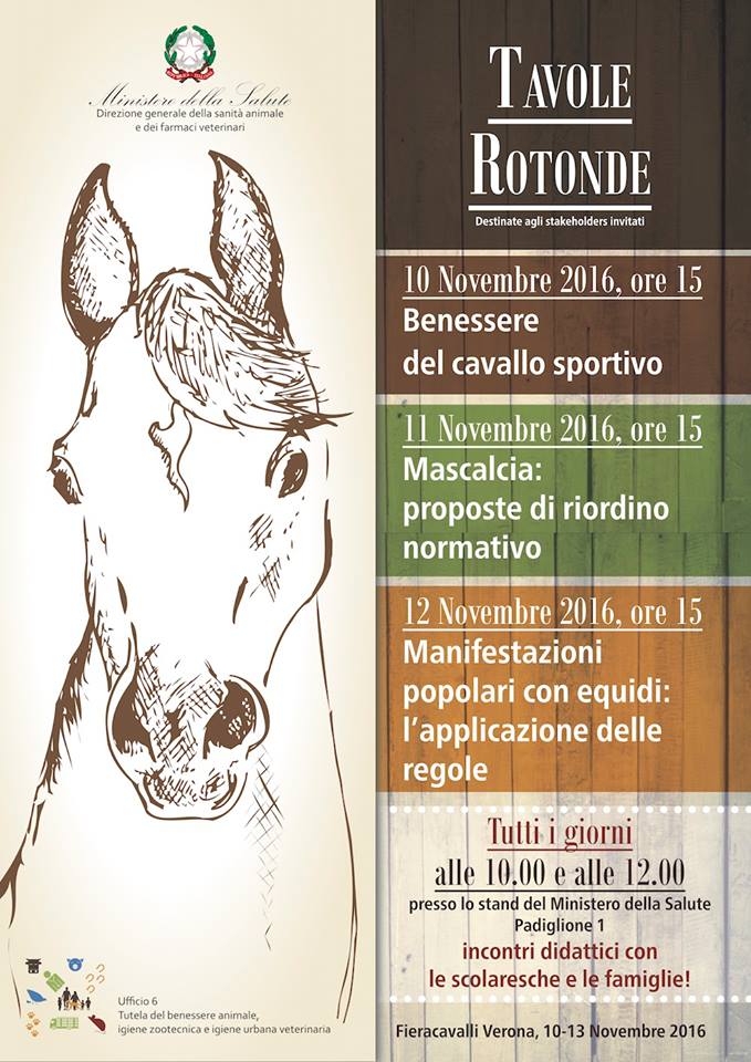 Ecco alcuni appuntamenti ai quali, tra gli altri, dare particolare attenzione: le Tavole Rotonde organizzate da Ministero della Salute per promuovere la salute e il benessere del cavallo: da giovedì 10 a domenica 13 novembre i medici veterinari della Direzione Generale della Sanità Animale e dei Farmaci Veterinari saranno presenti presso lo Stand nel Padiglione 1 per promuovere la salute e il benessere del cavallo. La presenza del Ministero alla tradizionale manifestazione veronese rappresenta un momento di continuità con la Conferenza nazionale sul benessere animale che si è tenuta a Roma lo scorso aprile e sarà l’occasione per approfondire direttamente con gli addetti ai lavori alcuni temi centrali relativi al settore degli equidi. Giovedì 10, alle ore 15, si parlerà di “Benessere del cavallo sportivo”. Venerdì 11, alla stessa ora, il tema sarà “Mascalcia: proposte di riordino normativo”. Sabato 12, infine, al centro del dibattito la nuova ordinanza ministeriale dedicata ai palii: “Manifestazioni popolari con equidi: l’applicazione delle regole”.