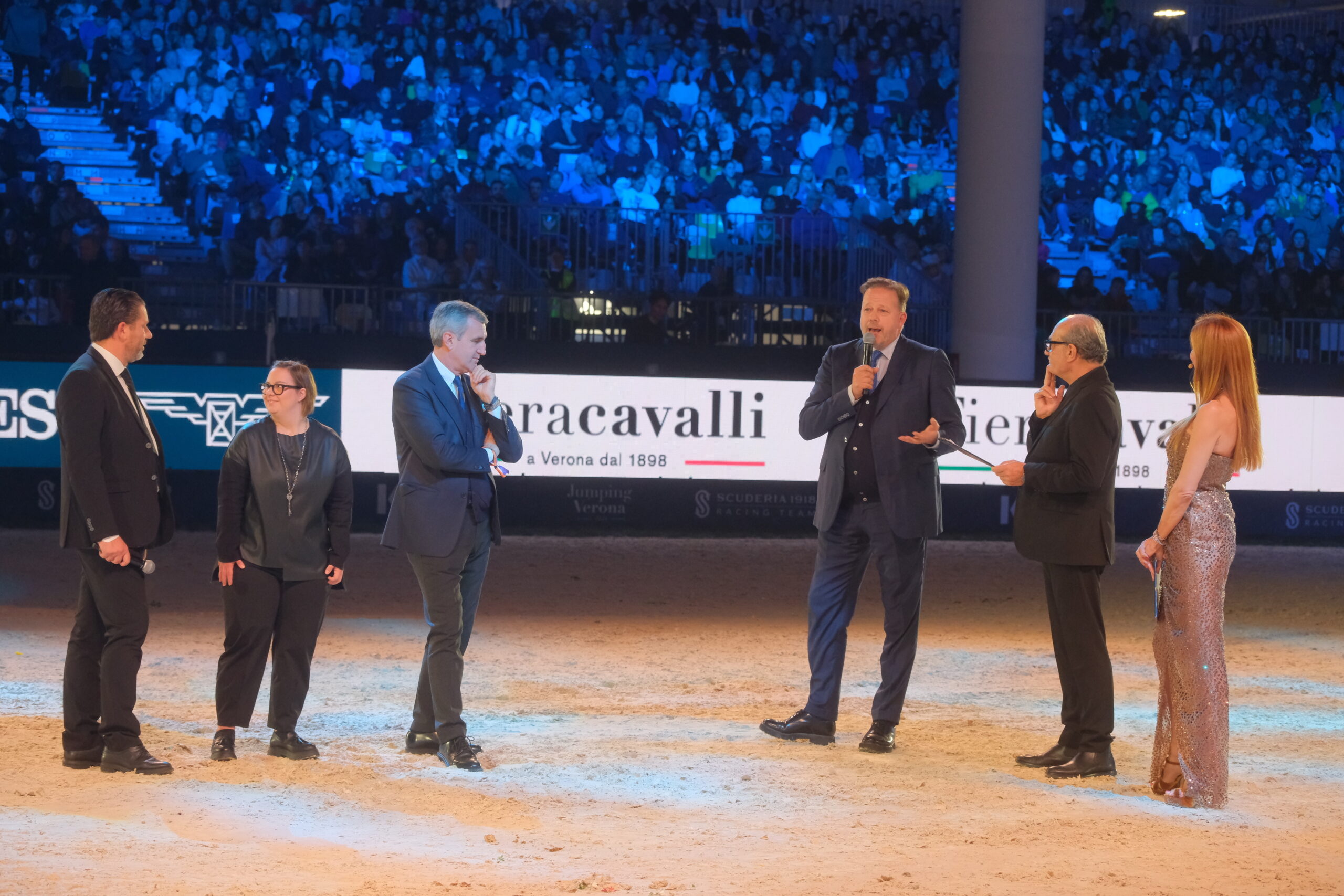Lo speaker di Radio Monte Carlo Maurizio di Maggio e Veronica Maya hanno accolto, nel ring d’onore del Padiglione 8, il Presidente di Veronafiere Federico Bricolo, il Presidente FISE Marco di Paola e il Presidente di AGBD Associazione Sindrome di Down Alberto Maculan, insieme a Gaia.