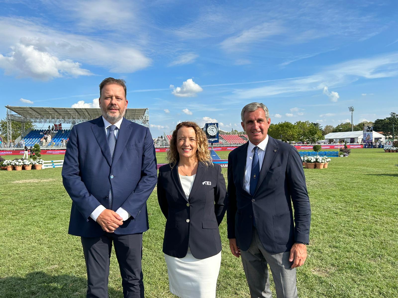 Stretta di mano, in occasione del FEI Jumping European Championship di Milano, tra il segretario generale della FEI, Sabrina Ibáñez, Marco Di Paola, presidente FISE, e Federico Bricolo, presidente di Veronafiere. L’incontro, oggi, ha sancito il rinnovo quadriennale della partnership che conferma, fino al 2027, la Fieracavalli di Verona come unico palcoscenico in Italia della Longines FEI Jumping Word CupTM.