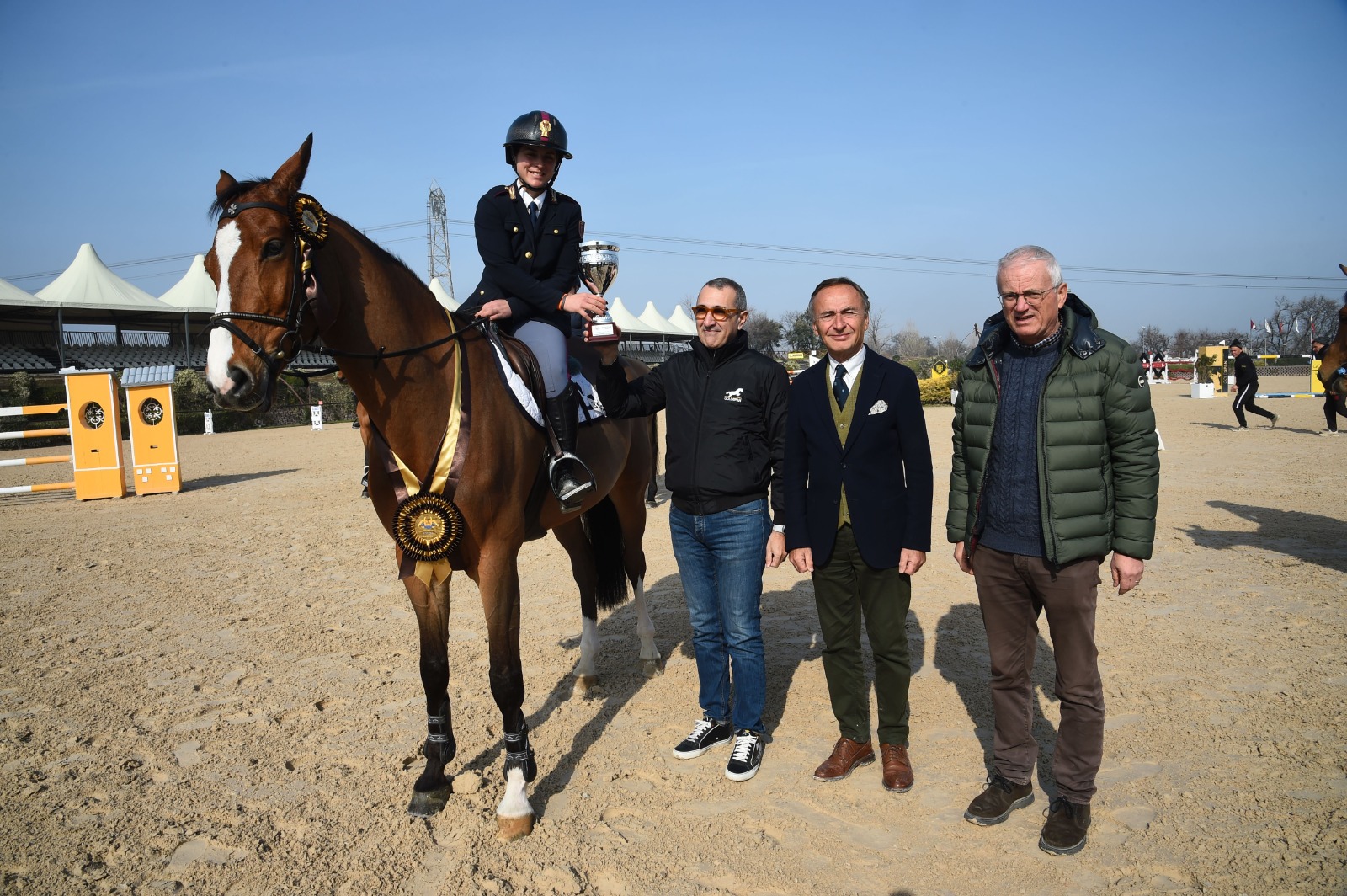 L’Agente delle Fiamme Oro Francesca Ciriesi, reduce dalla vittoria nella 145 Ranking di ieri (+ informazioni: clicca qui), ha scelto di presentare nella gara più importante l’olandese di 10 anni Jandino van de Krumelhaeve (Dexter R x Sam R). Il castrone baio tra le redini dell’amazzone azzurra ha messo a segno due percorsi impeccabili e nel tempo imbattibile di 41”.04 si è portato in testa alla classifica del Grand Prix. Jandino si trova sotto la sella di Francesca Ciriesi solamente dal mese di ottobre 2023 ed insieme hanno già collezionato un terzo posto nella categoria 6 barriere del CSI5*-W di Lipsia.