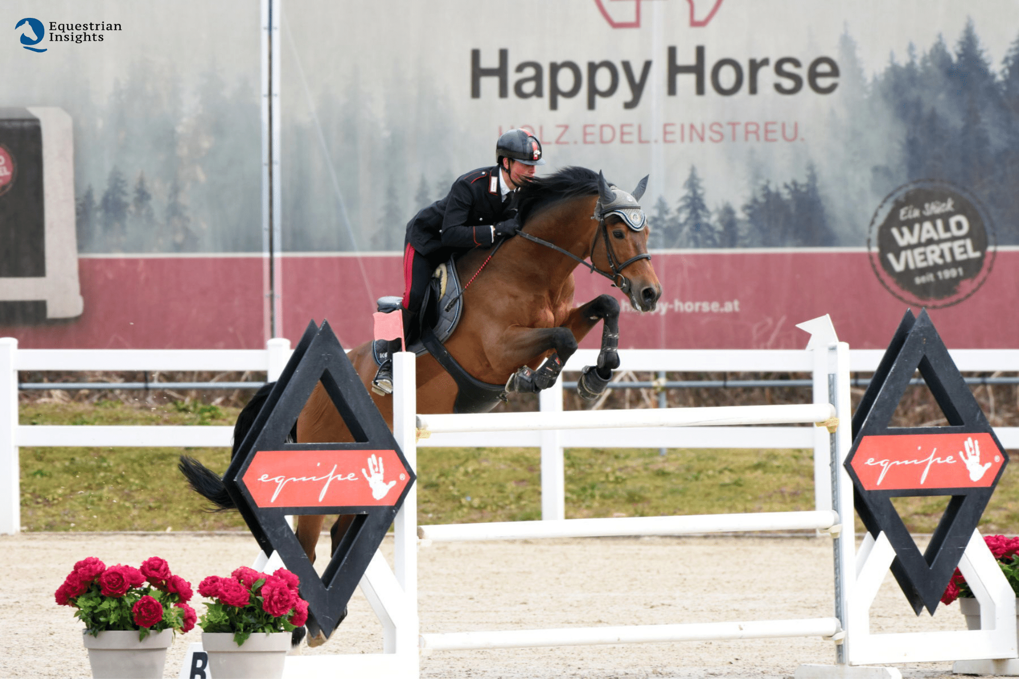 È stata oggi la volta di Francesco Curreddu che si è imposto nel Grand Prix presentato da Happy Horse del CSI2*, disputatosi nel primo pomeriggio; il carabiniere in sella al fidato stallone italiano classe 2006 Necofix (Eco del Castegno x Avenir) ha messo la sua firma sulla categoria con formula a jump-off portando a termine due percorsi impeccabili nel tempo inavvicinabile di 38”:43. Lo stesso binomio aveva conquistato la Terza Piazza lo scorso venerdì nella Ranking Class presentata dal nostro magazine: Equestrian Insights, lasciando la vittoria della gara al fratello più giovane, Lorenzo (+ info: clicca qui).