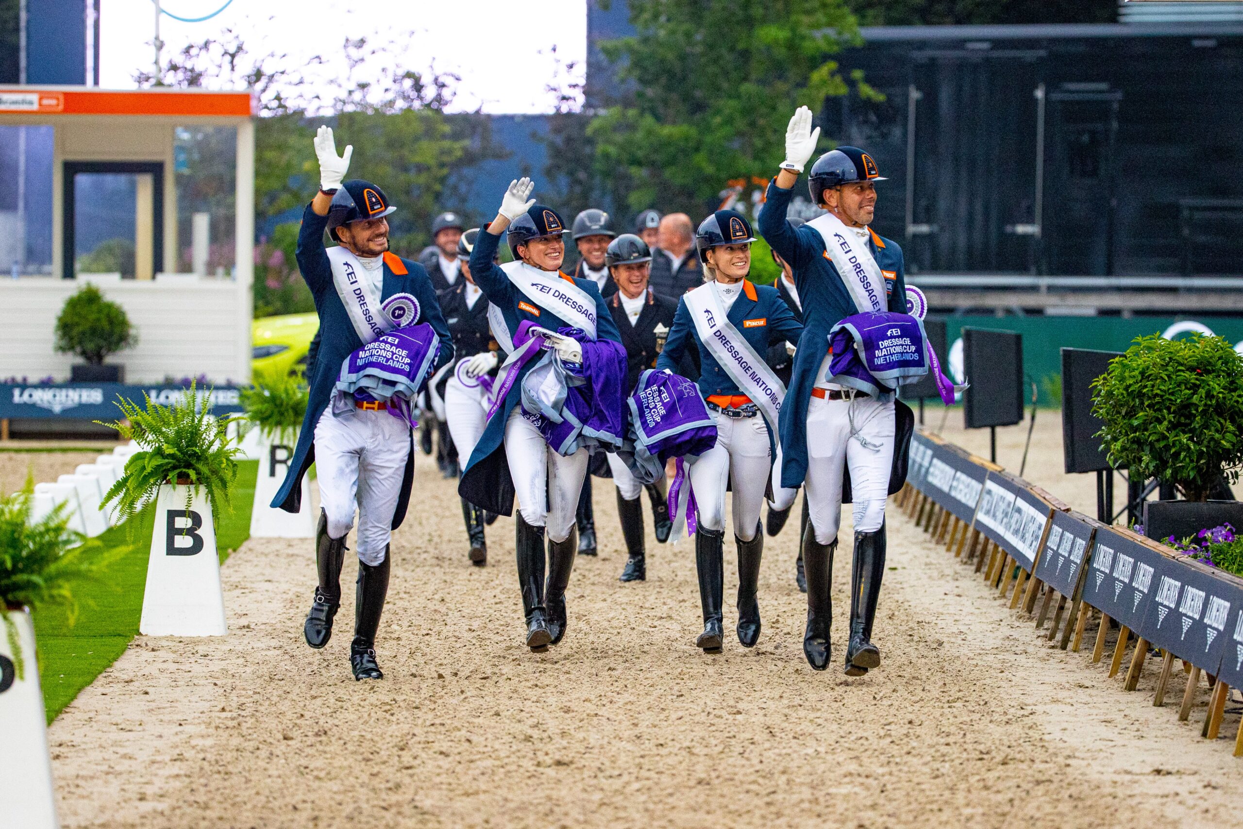 Erano solo tre i team al via, e grande è stata la tensione fino all’ultimo: Marlies van Baalen su Go Legend, Dinja van Liere con Hermes, Hans Peter Minderhoud su Glock’s Dream Boy N.O.P. e Edward Gal con Glock’s Total Us hanno completato Grand Prix Special e Freestyle con un punteggio totale pari a 15, davanti alla Germania (19), che ha schierato Werth, Dorothee Schneider, Matthias Bouten e Matthias Alexander Rath. Al team belga la medaglia di bronzo (46), grazie agli sforzi di Thibault Vandenberghe, Laurence Vanommeslaghe, Domien Michiels e Alexa Fairchild.