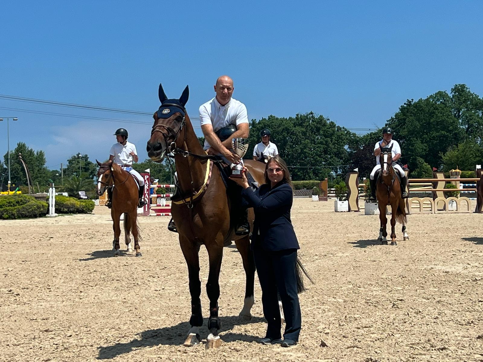 E’ stato Alberto Carrara a trionfare nel Gran Premio dell’Equieffe Equestrian Centre, in sella all’11 anni Mowgli Van’t Heike (stallone, BWP, Epleaser van’t Heike x Cassini I) è salito sul primo gradino del podio con un doppio netto siglato nel tempo più veloce di 43”.28. Alle sue spalle Camilla Vittadini ha presentato Danube de Hus (2013, stallone, Selle Français, Gastronom de Hus x Galoubet A) chiudendo in Piazza d’Onore, anche per questo binomio non ci sono stati errori in 43”.75. Matilde Giorgia Bianchi è salita sul terzo gradino del podio con Fulvia d’Arvor (2015, femmina, Selle Français, Quid de Talma x Le Tot de Semilly), 0 le loro penalità nei due percorsi nel tempo 43”.93.
