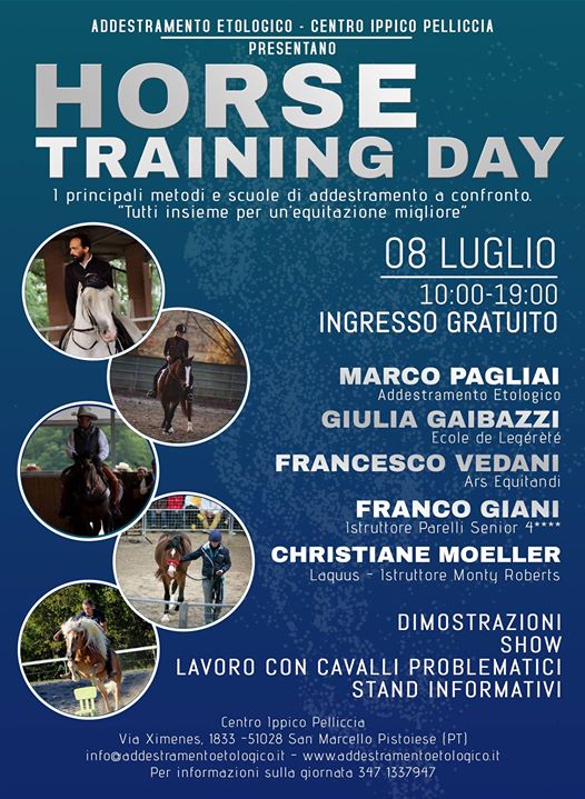 In un celebre aforisma, Nilde Iotti sosteneva la necessità “di cogliere negli altri quello che di positivo sanno darci e non combattere ciò che è diverso, che è ‘altro’ da noi“. Leit motiv ribadito da diversi pensatori e filosofi quello per il quale sia profondamente sbagliato giudicare aprioristicamente ciò che non si conosce, convinti di aver raggiunto e di possedere completamente la verità: ogni occasione di confronto dev’essere piuttosto momento essenziale per imparare e per comprendere. Per questa ragione va salutata e sostenuta una brillante iniziativa, unica nel suo genere, che riguarda i cavalli e il loro addestramento / formazione: l’Horse Training Day, per la prima volta in Italia, sarà organizzato l’8 luglio prossimo presso il Centro Ippico Pelliccia – Addestramento Etologico (San Marcello Pistoiese – PT). Si tratta di una giornata di confronto fra le migliori scuole e metodi “dolci” di horsetraining: Addestramento Etologico (Marco Pagliai), Istruttori Parelli (Franco Giani), Istruttori dell’Ecole de Légèreté (Giulia Gaibazzi), Ars Equitandi (Francesco Vedani – in foto di copertina dell’articolo), Istruttori Monty Roberts (Christiane Moeller – Laquus) tutti a confronto con l’intento comune volto a raggiungere un’equitazione migliore. La giornata sarà caratterizzata da dimostrazioni live, show e lavoro con cavalli problematici.