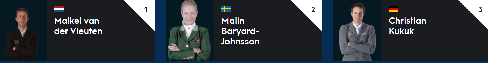 La classifica provvisoria del Longines Global Champions Tour vede saldo in vetta l’olandese Maikel Van der Vleuten con 175 punti, seguito in seconda posizione dalla svedese Malin Maryard-Johnsson con 160.14 punti. Il teutonico Christian Kukuk detiene la terza posizione provvisoria con 134.2 punti.