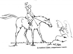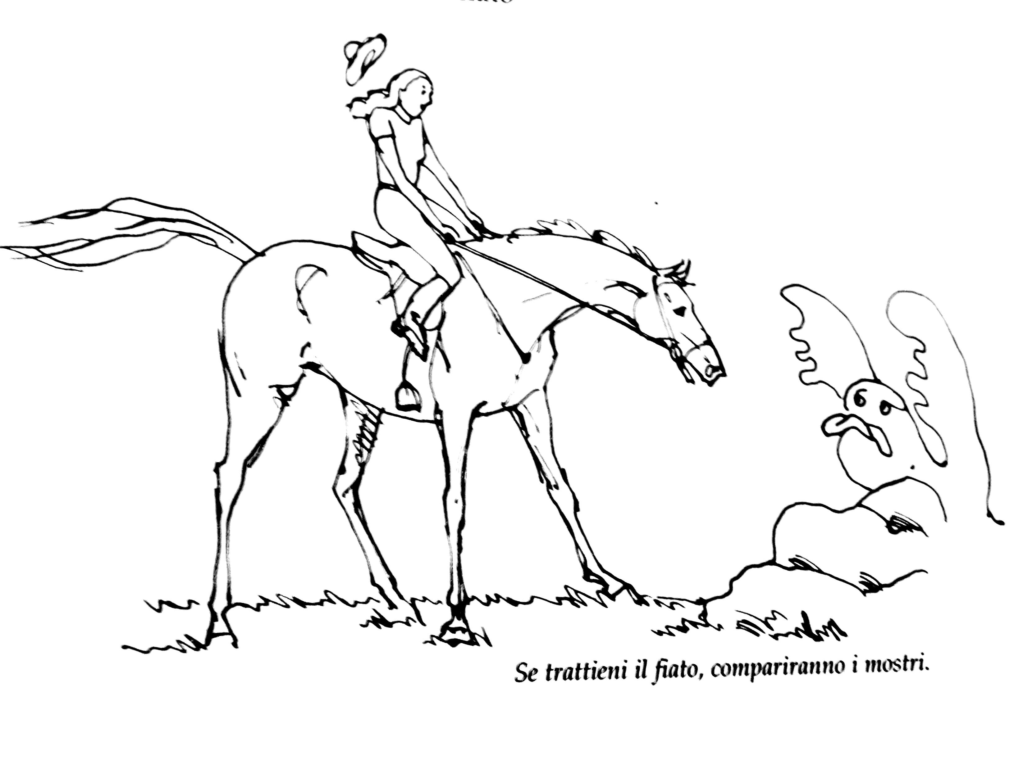 E’ noto che la maggior parte dei cavalieri, specie durante lo svolgimento di una competizione, trattenga il respiro o effettui solo pochi ed irregolari atti respiratori; meno noto è il fatto che anche durante una normale sessione di allenamento in maneggio la maggior parte delle persone in sella abbia un’attività respiratoria non regolare: questa condizione non solo costringe il cuore e il sistema circolatorio ad un iperlavoro, ma influisce direttamente sul rilassamento della muscolatura e dunque sull’armonia dello stare in sella. Un uso corretto della respirazione è di grande importanza: provate a trattenere il fiato per dieci secondi, per poi tornare a respirare normalmente; per tutti diverrà evidente come il corpo si contragga bloccando la respirazione, e come esso si rilassi subito quando riprendiamo regolarmente l’attività. Arrestando la respirazione o respirando inadeguatamente si creano tensioni nel corpo, che il cavallo puntualmente avvertirà e registrerà: matematicamente, se anche involontariamente tratteniamo il fiato, compariranno i mostri: