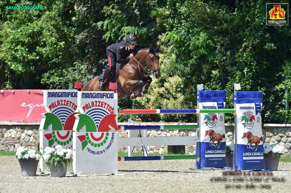 L’Appuntato Emanuele Gaudiano ha centrato la vittoria con Nikolaj de Music, questo binomio ha concluso senza errori nel tempo imbattibile di 62”.47. Il bel baio figlio diretto di Kannan GFE con mamma da Nabab de Reve è nato in Belgio nel 2013 e la sua ultima vittoria tra le redini del cavaliere azzurro risale a febbraio durante il CSI5*-W di Sharjah. (+ informazioni: clicca qui) Dopo qualche mese di riposo Nikolaj de Music ha partecipato al CSI2* di St. Tropez – Grimaud a giugno ed ecco arrivare oggi un’altra vittoria che va ad aggiungersi al curriculum del potente BWP.
