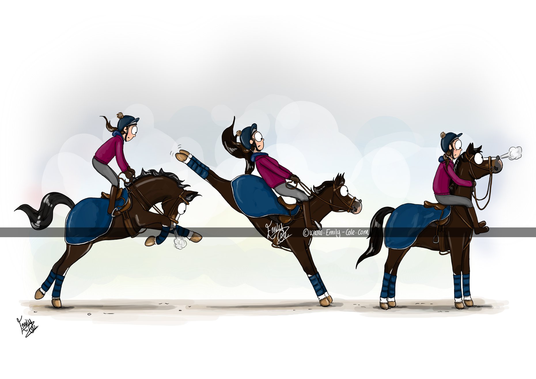 Navigando sul suo profilo instagram si apre un mondo di scenette divertenti e tipiche di molte scuderie. La sua pagina web (www.emily-cole.com) ci si presenta un’appassionata di equitazione con due stupendi destrieri Echo e Swift. I cavalli di Emily, ed ora mi riferisco ai fumetti, la cui particolarità sono grandi occhi espressivi, sono i compagni di tutti i giorni dei cavalieri che li seguono nelle loro giornate, sia nel combinare disastri sia nell’essere inseparabili amici.
