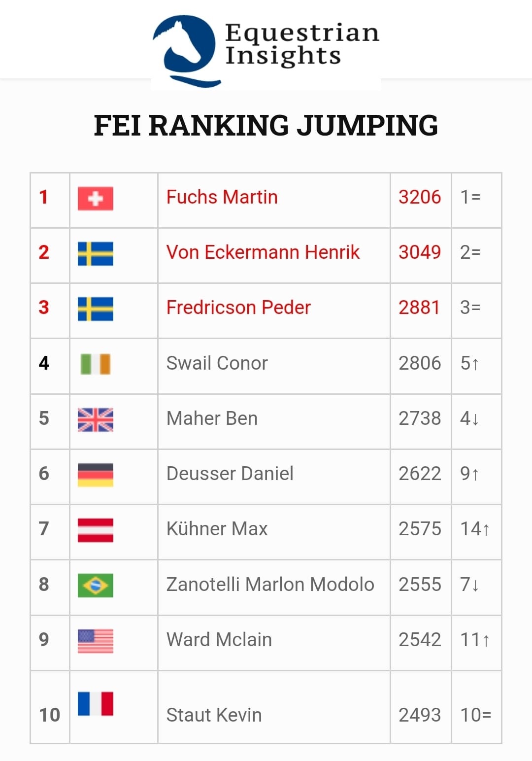 (Olympic individual & team gold medalist/ European team gold & individual silver medalist) scende di una posizione, collocandosi al quinto posto. Daniel Deusser (GER) sale di ben tre posizioni nella Top Ten, raggiungendo il sesto piazzamento, mentre l’austriaco Max Kühner entra questo mese in Top Ten, passando dalla quattordicesima alla settima posizione.