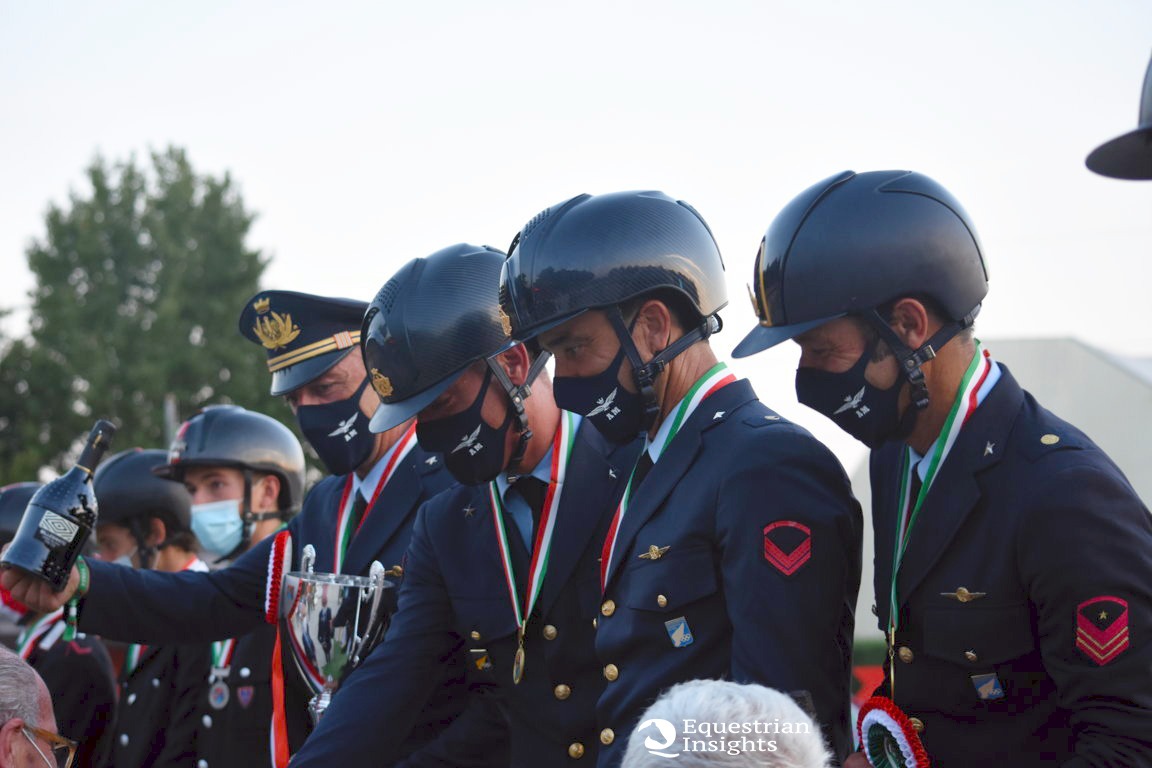 Con capo équipe il 1° Maresciallo Stefano Nogara, ecco i binomi componenti la squadra che ha meritato la medaglia d’oro (0/0): lo stesso Maresciallo Stefano Nogara con Date Night, il 1° Aviere Capo Luca Marziani in sella a Don’t Worry B, il 1° Aviere Scelto Qualifica Speciale Paolo Mencolini in sella a Boyscout d’Auge, il 1° Aviere Capo Emilio Bicocchi in sella a Call Me.