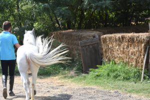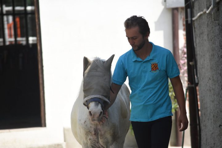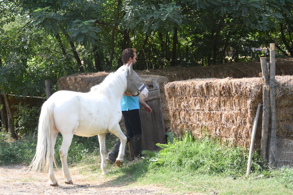 Siamo venuti a conoscenza della vicenda di Galubé quando la storia era già nel suo “lieto fine”, pur con le ovvie difficoltà: Maria Teresa ha incontrato l’intelligenza, tutta l’empatia e la disponibilità del personale dell’Asd Il Mulino (Villalvernia – AL), in particolare nel primo responsabile della scuderia ed istruttore Paolo Venzano (nelle foto che seguono con Galubé), che non si è dato pace finché non ha trovato una soluzione a dir poco semplice e geniale, che qui presentiamo proprio perché, chissà, magari potrà essere di esempio, uno spunto utile per altre difficili situazioni simili: Galubé, la pony ventitreenne cieca, non poteva stare in un normale paddock, vicina agli altri cavalli e all’aperto, in piena libertà di movimento, perché o si feriva sbattendo contro le palizzate o, peggio, finiva sempre contro il filo elettrificato (cosa che ovviamente la terrorizzava). Senza corrente, si trovava poi involontariamente a vagare fuori dal paddock, esposta ad ogni pericolo, non vedendo nulla. Finalmente, ecco l’idea: costruire per lei un paddock delimitato da balloni di fieno. Semplice, ma geniale. Ora Galubé può stare all’aperto, può, pur con i limiti della sua età e della sua grave invalidità, vivere con dignità la fine dei suoi giorni. Non è raro oggi vederla rotolarsi a terra felice, o persino accennare un galoppino incerto nel suo piccolo paddock… il tutto, grazie all’amore e alla sensibilità di poche, diciamolo, troppo rare persone. Andava detto, andava evidenziato: fossero tutti così.