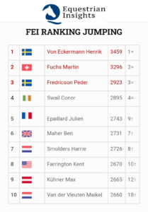 Il cavaliere d’Oltralpe Julien Epaillard (FRA), con 2743 punti, continua la sua scalata nella classifica, passando rispettivamente dal nono al quarto posto. Con 2731 punti, Ben Maher (GBR) sale al sesto posto (rispetto al mese scorso in cui era settimo), mentre Harrie Smolders (NED) passa dalla posizione n. otto alla settima. Crescendo anche per lo statunitense Kent Farrington, numero dieci del mese scorso, oggi ottavo; Max Kühner (AUT) e Maikel van der Vleuten (NED) entrano in Top Ten, rispettivamente in 9^ e 10^ posizione.