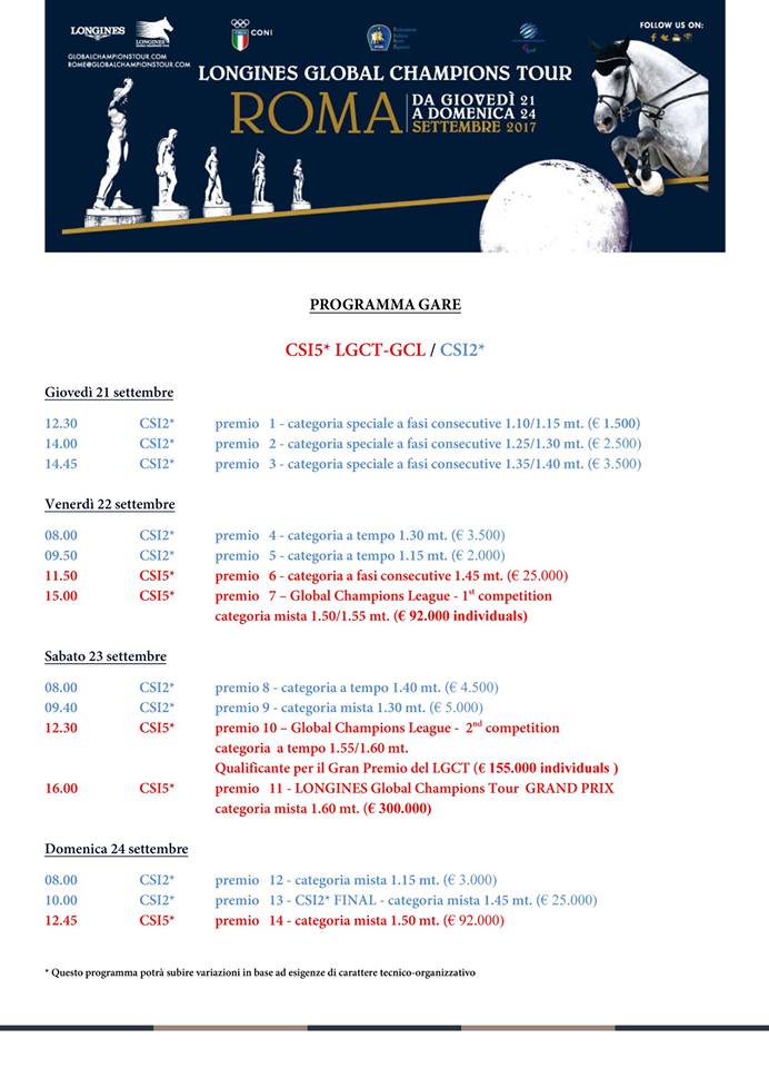 Come molti di voi sapranno, mancano ormai pochi giorni all’inizio dell’importante appuntamento romano Longines Global Champions Tour, la 14^ e penultima Tappa, che si svolgerà allo Stadio dei Marmi “Pietro Mennea” dal 21 al 24 settembre prossimi.