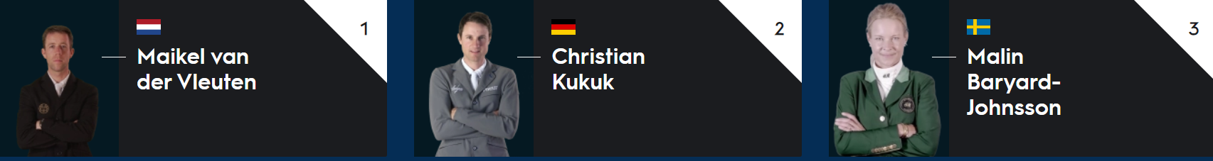 Al termine della sesta tappa del Longines Global Champions Tour conduce la classifica provvisoria proprio Van Der Vleuten con all’attivo 175 punti, seguito dal teutonico Christian Kukuk con 134.2 e l’amazzone svedese Malin Baryard-Johnsson in terza posizione con un totale di 130.14; ancora un’amazzone detiene la quarta posizione si tratta di Edwina Tops-Alexander per l’Australia con 117 punti.