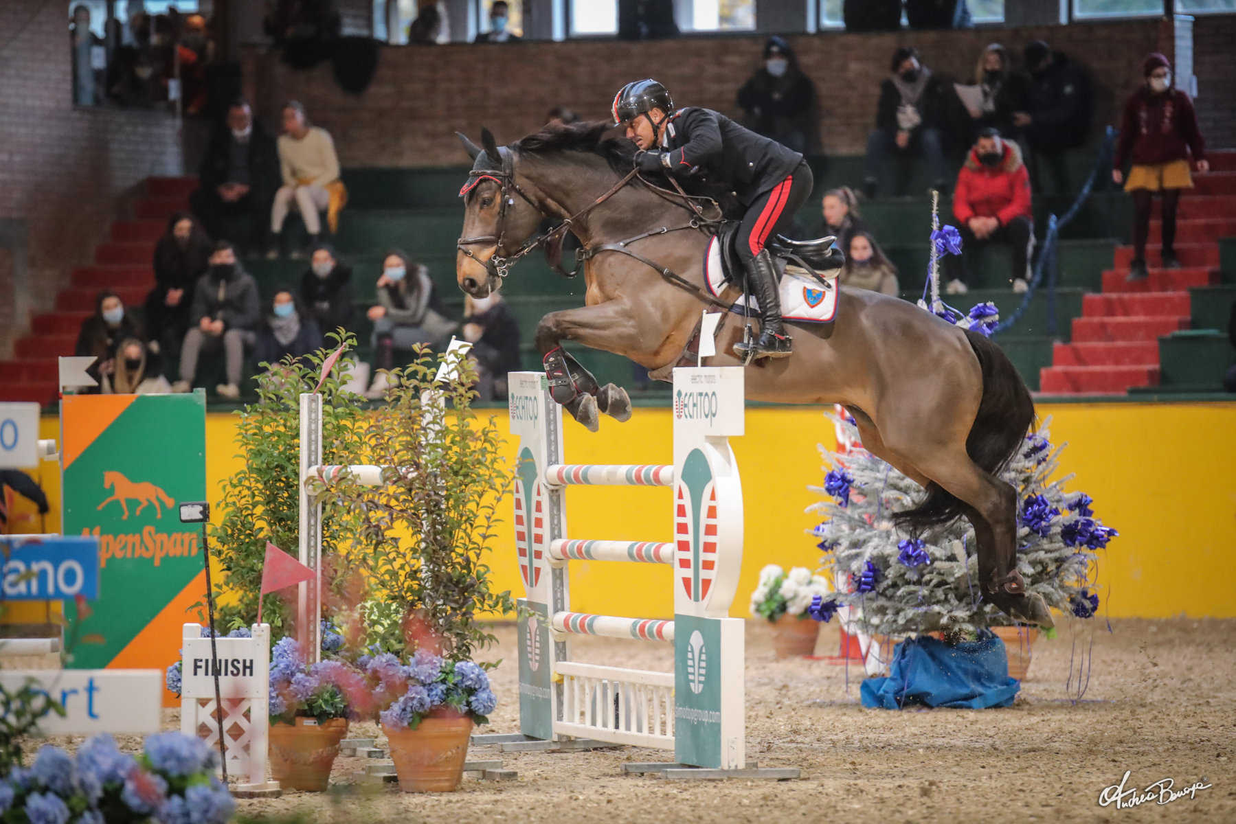 Poi tutta l’attenzione è per il Gran Premio QN – il Resto del Carlino: il direttore di campo Elio Travagliati e il suo assistente Fulvio Santi hanno valorizzato la qualità dei binomi partecipanti con un percorso tecnico e bellissimo che non dà tregua, dal primo all’ultimo salto. Nel barrage della C145/150 a due manches Bianchi, Martinengo Marquet, Gasparetto, Marziani, Bruno Chimirri, Casadei junior, Bicocchi, Govoni, Lupino e Turchetto. Un oxer in volta che lascia alle spalle la porta d’entrata ha dato filo da torcere a tanti binomi, nessuno dei quali finisce con la fedina di percorso esente da errori. Ma tra tutti il migliore è l’appuntato scelto q.s. dell’Arma Bruno Chimirri, che con il senatore Tower Muche è il più veloce e vince per la terza volta il Master d’Italia indoor di salto ostacoli al G.e.s.e. di San Lazzaro di Savena. Dietro di lui Emilio Bicocchi che con Flinton ha cercato il tempo con il coltello tra i denti, ottima terza la sempre stilosissima ed efficace Giulia Martinengo Marquet con Kiwi Kick, 4 penalità per ognuno di questi binomi a cui il tempo ha dato ordine di classifica. Coincide con il podio del GP anche la classifica individuale del Campionato interforze: oro a Bruno Chimirri per l’Arma, argento per Emilio Bicocchi dell’Aeronautica Militare e bronzo a Giulia Martinengo Marquet che ha ricevuto anche gli onori come miglior amazzone dell’evento.