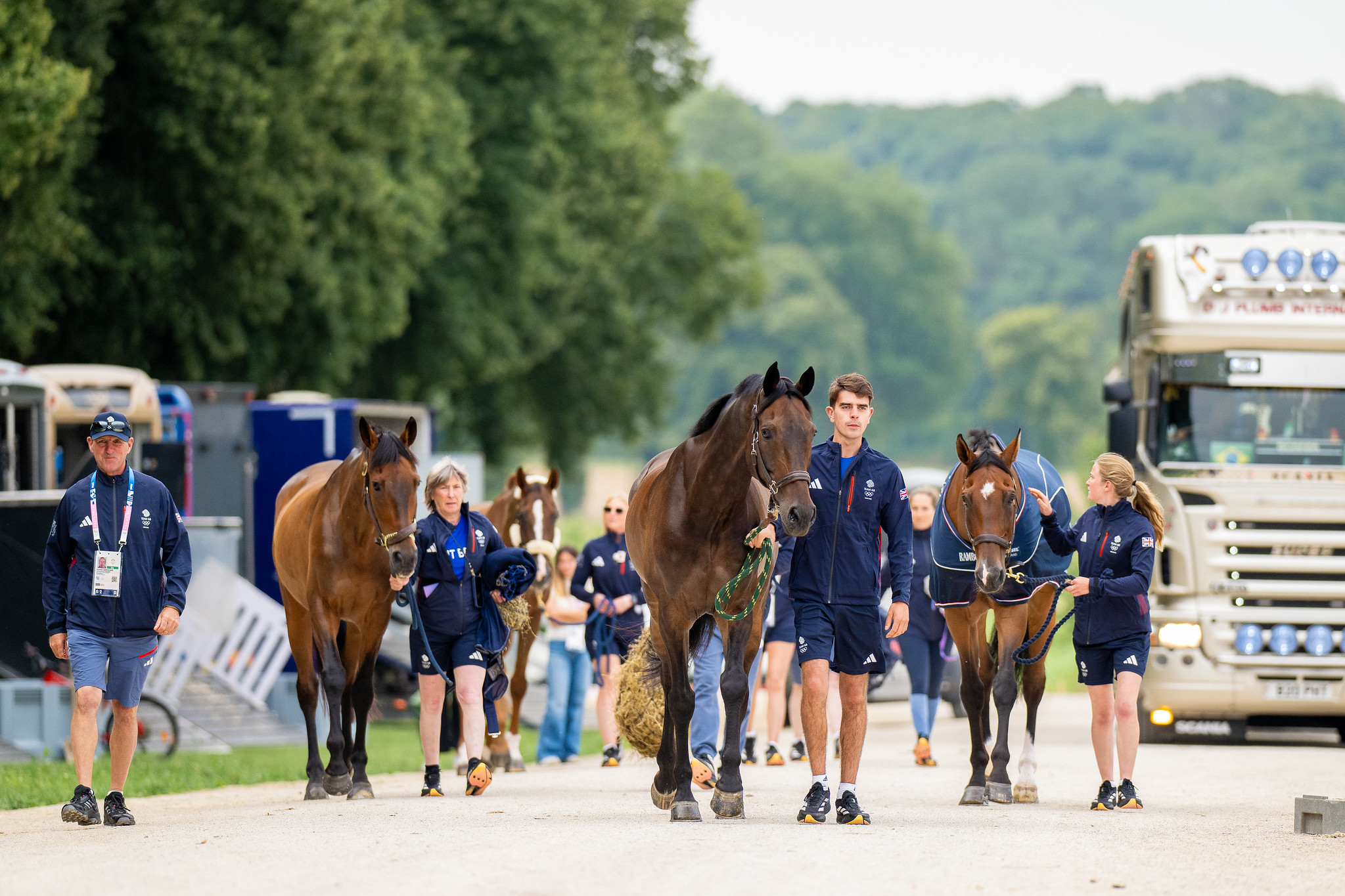 © Comunicato Stampa FEI – trad. ita a cura di L. Ruffino; foto: da sx a dx Sarah Charnley e Lordships Graffalo – Alison Bell e Banzai du Loir – Adam Short e JL Dublin – Tilly Hughes e London 52 arrivati al Chateau de Versailles per i Paris 2024 Olympic Games © FEI/Benjamin Clark