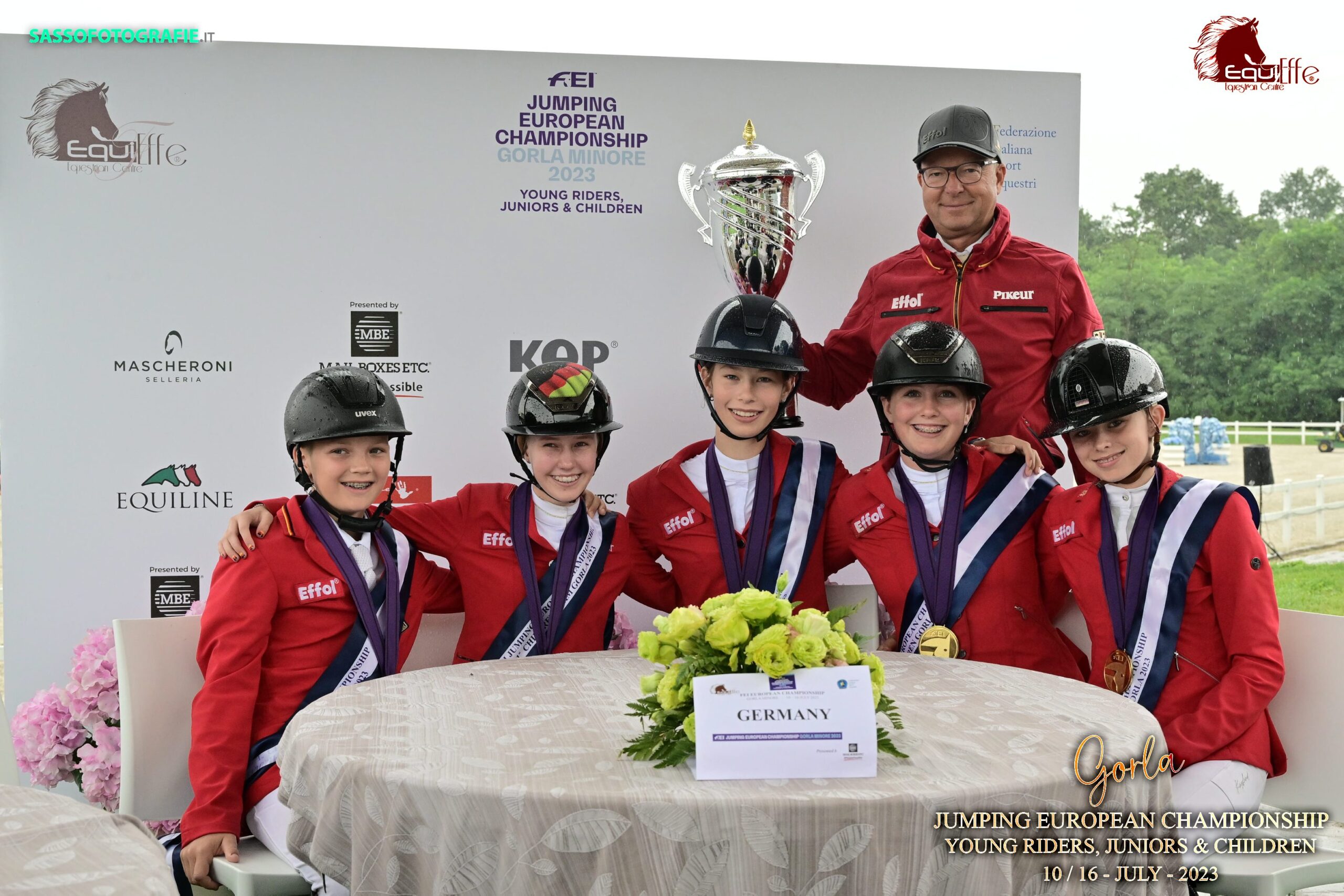 Dopo un emozionante barrage che ha visto sfidarsi Germania, Francia ed Inghilterra per l’assegnazione delle medaglie, a meritare la medaglia dal metallo più ambito è stata la Germania. La squadra vincitrice del Campionato Europeo a squadre Children è stata composta da: Brianne Beerbaum/Carlucci 20, Maximilian Fimpel/Cartagena, Luise Konle/Dressed For Success, Jolie Marie Kühner/Dialo e Colin Sorg/Casillas 11; ed ha terminato con 0 penalità nel tempo migliore di 119”.12. Lo Chef d’Equipe Eberhard Seemann ha commentato: “Sono naturalmente molto felice di questo primo posto, abbiamo replicato la vittoria di Oliva Nova dello scorso anno. Nonostante il caldo dei primi giorni non posso che essere contento per come i ragazzi abbiano gestito la pressione e la competizione in generale”.