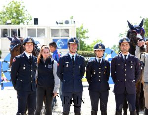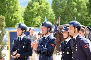 Piazza d’onore e medaglie d’argento per la squadra dell’Esercito Italiano (capo équipe: Ten. Col. Francesco Guarducci), rappresentata dal Ten. Col. Gabriele Giusti con Ray della Favorita, il Caporal Mag. scelto Roberto Cristofoletti con Chicca 43, il Caporal Mag. scelto Tiziana Malagigi in sella a Murra Mia e il Caporal Mag. Scelto Filippo Martini Di Cigala con Quaynar. Medaglie di bronzo (terzo gradino del podio) per la squadra delle Fiamme Oro Equitazione – Polizia di Stato (capo équipe: Ass. Capo: Marco Bergomi), composta dall’Assistente Capo Vincenzo Chimirri in sella a Veleno, l’Assistente Capo David Sbardella con Bernini di Vallerano, l’Agente Luca Coata con Berlisha e l’Agente Federico Ciriesi con Calais D’Argilla Z. Quarta posizione per la squadra dell’Arma dei Carabinieri (capo équipe: Mar. Capo Paolo Lacquaniti), composta da: carabiniere Filippo Codecasa in sella a Gulian, carabiniere Filippo Marco Bologni in sella a Touloren, carabiniere Emanuele Massimiliano Bianchi con Charlotta II, App. scelto Massimo Grossato con Benz Z.