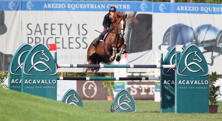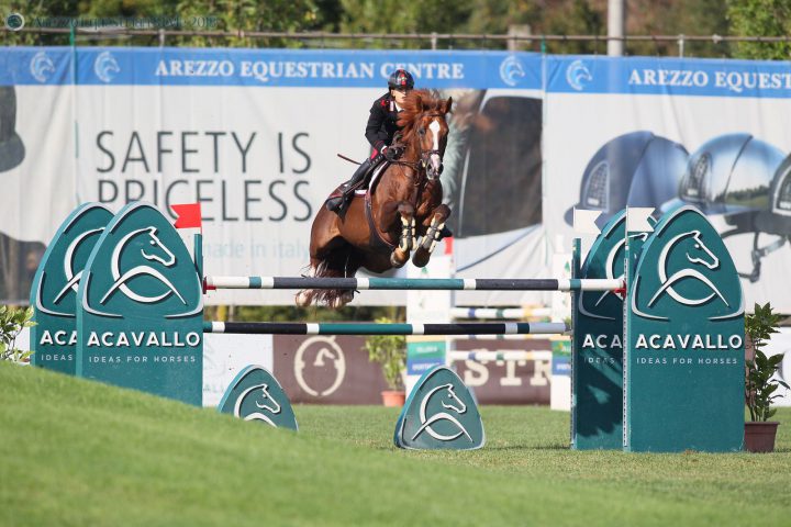 Il carabiniere scelto Filippo Bologni rientra dall’Equestrian Tour / CSI2*, organizzato presso gli impianti dell’Arezzo Equestrian Centre, con ben due podi meritati nelle categorie maggiori di questo weekend in sella al suo stallone sauro Quidich de la Chavee. Il binomio ha fatto sua oggi, domenica 2 settembre, la Piazza d’Onore nel Grand Prix con ostacoli ad h 1,45 mt Longines Ranking Class (0/4; 52″:20), gara maggiore dell’internazionale aretino – che ha visto solo 3 binomi con zero penalità nel percorso base tra i 42 partecipanti accedere al barrage: oltre a Bologni/Quidich, Antonio Maria Garofalo in sella a Hope van de Horthoeve (0/0; 47″:10), cui è andata la vittoria della gara, e Roberto Turchetto in sella ad Adare (0/18; 64″:39), in terza posizione, a chiusura di un bellissimo podio tutto azzurro in questa competizione internazionale. Classifica: clicca qui