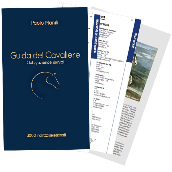 Nuova edizione ampliata e aggiornata: anche quest’anno è disponibile la Guida del Cavaliere del giornalista Paolo Manili, con oltre 200 pagine, 3000 tra indirizzi e contatti utili suddivisi per regione e provincia (circoli Ippici, ippodromi, federazioni, associazioni, aziende e professionisti del settore equestre tra cui le cliniche veterinarie, i maniscalchi e i servizi di trasporto). Il volume è inoltre arricchito di informazioni di carattere storico e culturale (storia dell’equitazione, le principali razze di cavalli, i campioni azzurri dal dopoguerra, curiosità, proverbi).