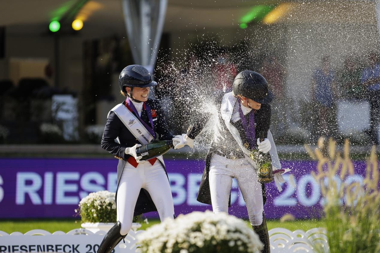 © Comunicato Stampa FEI; trad. it. a cura di redaz.; foto: Jessica von Bredow-Werndl (GER) and Charlotte Fry (GBR) during the award ceremony from the Grand Prix Freestyle at the FEI Dressage European Championship 2023 in Riesenbeck (GER)